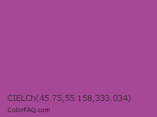 CIELCh 45.75,55.158,333.034 Color is a normal magenta color and the nearest color is Purpureus #9a4eae. Hex code #a74897 and RGB value is rgb(167,72,151). In RGB color space, this color is composed of 65% red, 28% green, 59% blue, In CMYK color space, this color is composed of 0% cyan, 57% magenta, 10% yellow , 35% black , In HSL color space, this color has a hue angle of 310° , 40% saturation and 47% lightness.