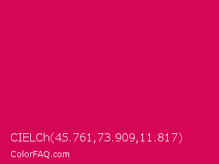 CIELCh 45.761,73.909,11.817 Color is a normal rose color and the nearest color is Debian Red #d70a53. Hex code #d60557 and RGB value is rgb(214,5,87). In RGB color space, this color is composed of 84% red, 2% green, 34% blue, In CMYK color space, this color is composed of 0% cyan, 98% magenta, 59% yellow , 16% black , In HSL color space, this color has a hue angle of 336° , 95% saturation and 43% lightness.