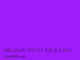 CIELCh 45.767,115.505,314.917 Color is a normal purple color and the nearest color is Veronica #a020f0. Hex code #a01bf9 and RGB value is rgb(160,27,249). In RGB color space, this color is composed of 63% red, 11% green, 98% blue, In CMYK color space, this color is composed of 36% cyan, 89% magenta, 0% yellow , 2% black , In HSL color space, this color has a hue angle of 276° , 95% saturation and 54% lightness.