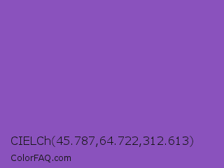 CIELCh 45.787,64.722,312.613 Color is a normal purple color and the nearest color is Deep Lilac #9955bb. Hex code #8a52bd and RGB value is rgb(138,82,189). In RGB color space, this color is composed of 54% red, 32% green, 74% blue, In CMYK color space, this color is composed of 27% cyan, 57% magenta, 0% yellow , 26% black , In HSL color space, this color has a hue angle of 271° , 45% saturation and 53% lightness.