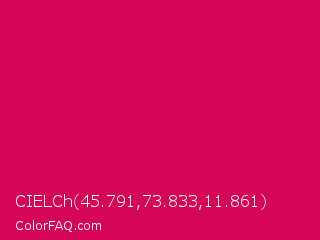 CIELCh 45.791,73.833,11.861 Color is a normal rose color and the nearest color is Debian Red #d70a53. Hex code #d60657 and RGB value is rgb(214,6,87). In RGB color space, this color is composed of 84% red, 2% green, 34% blue, In CMYK color space, this color is composed of 0% cyan, 97% magenta, 59% yellow , 16% black , In HSL color space, this color has a hue angle of 337° , 95% saturation and 43% lightness.