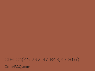 CIELCh 45.792,37.843,43.816 Color is a normal color and the nearest color is Sepia Skin #9e5b40. Hex code #a15942 and RGB value is rgb(161,89,66). In RGB color space, this color is composed of 63% red, 35% green, 26% blue, In CMYK color space, this color is composed of 0% cyan, 45% magenta, 59% yellow , 37% black , In HSL color space, this color has a hue angle of 15° , 42% saturation and 45% lightness.
