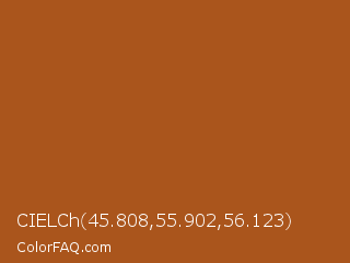 CIELCh 45.808,55.902,56.123 Color is a normal orange color and the nearest color is Desert #ae6020. Hex code #aa551c and RGB value is rgb(170,85,28). In RGB color space, this color is composed of 67% red, 33% green, 11% blue, In CMYK color space, this color is composed of 0% cyan, 50% magenta, 84% yellow , 33% black , In HSL color space, this color has a hue angle of 24° , 72% saturation and 39% lightness.
