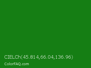 CIELCh 45.814,66.04,136.96 Color is a dark green color and the nearest color is India Green #138808. Hex code #157e14 and RGB value is rgb(21,126,20). In RGB color space, this color is composed of 8% red, 49% green, 8% blue, In CMYK color space, this color is composed of 83% cyan, 0% magenta, 84% yellow , 51% black , In HSL color space, this color has a hue angle of 119° , 73% saturation and 29% lightness.