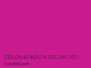 CIELCh 45.825,74.351,344.707 Color is a normal magenta color and the nearest color is Red Violet #c71585. Hex code #c91a8f and RGB value is rgb(201,26,143). In RGB color space, this color is composed of 79% red, 10% green, 56% blue, In CMYK color space, this color is composed of 0% cyan, 87% magenta, 29% yellow , 21% black , In HSL color space, this color has a hue angle of 320° , 77% saturation and 45% lightness.