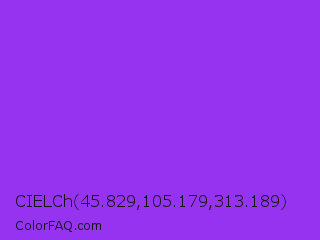 CIELCh 45.829,105.179,313.189 Color is a normal purple color and the nearest color is Blue Violet #8a2be2. Hex code #9633f0 and RGB value is rgb(150,51,240). In RGB color space, this color is composed of 59% red, 20% green, 94% blue, In CMYK color space, this color is composed of 38% cyan, 79% magenta, 0% yellow , 6% black , In HSL color space, this color has a hue angle of 271° , 86% saturation and 57% lightness.