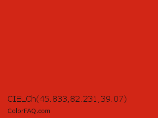CIELCh 45.833,82.231,39.07 Color is a normal red color and the nearest color is Maximum Red #d92121. Hex code #d22616 and RGB value is rgb(210,38,22). In RGB color space, this color is composed of 82% red, 15% green, 9% blue, In CMYK color space, this color is composed of 0% cyan, 82% magenta, 90% yellow , 18% black , In HSL color space, this color has a hue angle of 5° , 81% saturation and 45% lightness.