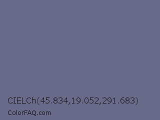 CIELCh 45.834,19.052,291.683 Color is a normal blue color and the nearest color is Storm Gray #717486. Hex code #696a8a and RGB value is rgb(105,106,138). In RGB color space, this color is composed of 41% red, 42% green, 54% blue, In CMYK color space, this color is composed of 24% cyan, 23% magenta, 0% yellow , 46% black , In HSL color space, this color has a hue angle of 238° , 14% saturation and 48% lightness.