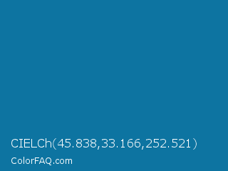 CIELCh 45.838,33.166,252.521 Color is a normal blue color and the nearest color is Allports #0076a3. Hex code #0d74a1 and RGB value is rgb(13,116,161). In RGB color space, this color is composed of 5% red, 45% green, 63% blue, In CMYK color space, this color is composed of 92% cyan, 28% magenta, 0% yellow , 37% black , In HSL color space, this color has a hue angle of 198° , 85% saturation and 34% lightness.