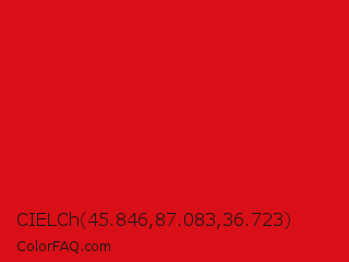 CIELCh 45.846,87.083,36.723 Color is a normal red color and the nearest color is Lava #cf1020. Hex code #d90f17 and RGB value is rgb(217,15,23). In RGB color space, this color is composed of 85% red, 6% green, 9% blue, In CMYK color space, this color is composed of 0% cyan, 93% magenta, 89% yellow , 15% black , In HSL color space, this color has a hue angle of 358° , 87% saturation and 45% lightness.