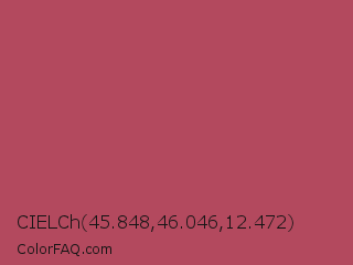 CIELCh 45.848,46.046,12.472 Color is a normal red color and the nearest color is Hippie Pink #ae4560. Hex code #b3495e and RGB value is rgb(179,73,94). In RGB color space, this color is composed of 70% red, 29% green, 37% blue, In CMYK color space, this color is composed of 0% cyan, 59% magenta, 47% yellow , 30% black , In HSL color space, this color has a hue angle of 348° , 42% saturation and 49% lightness.