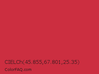 CIELCh 45.855,67.801,25.35 Color is a normal red color and the nearest color is Brick Red #c62d42. Hex code #cc2e40 and RGB value is rgb(204,46,64). In RGB color space, this color is composed of 80% red, 18% green, 25% blue, In CMYK color space, this color is composed of 0% cyan, 77% magenta, 69% yellow , 20% black , In HSL color space, this color has a hue angle of 353° , 63% saturation and 49% lightness.