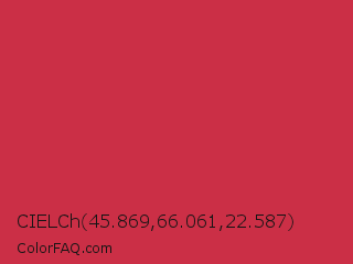 CIELCh 45.869,66.061,22.587 Color is a normal red color and the nearest color is French Raspberry #c72c48. Hex code #cb2f46 and RGB value is rgb(203,47,70). In RGB color space, this color is composed of 80% red, 18% green, 27% blue, In CMYK color space, this color is composed of 0% cyan, 77% magenta, 66% yellow , 20% black , In HSL color space, this color has a hue angle of 351° , 62% saturation and 49% lightness.