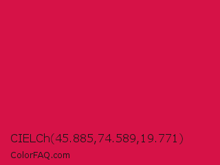 CIELCh 45.885,74.589,19.771 Color is a normal rose color and the nearest color is Crimson #dc143c. Hex code #d61247 and RGB value is rgb(214,18,71). In RGB color space, this color is composed of 84% red, 7% green, 28% blue, In CMYK color space, this color is composed of 0% cyan, 92% magenta, 67% yellow , 16% black , In HSL color space, this color has a hue angle of 344° , 84% saturation and 45% lightness.