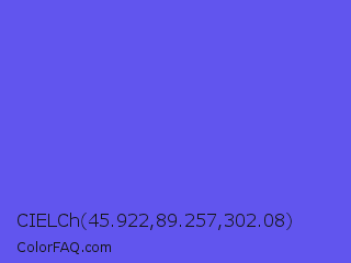CIELCh 45.922,89.257,302.08 Color is a light indigo color and the nearest color is Majorelle Blue #6050dc. Hex code #6155ee and RGB value is rgb(97,85,238). In RGB color space, this color is composed of 38% red, 33% green, 93% blue, In CMYK color space, this color is composed of 59% cyan, 64% magenta, 0% yellow , 7% black , In HSL color space, this color has a hue angle of 245° , 82% saturation and 63% lightness.