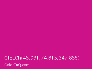 CIELCh 45.931,74.815,347.858 Color is a normal magenta color and the nearest color is Red Violet #c71585. Hex code #cd1289 and RGB value is rgb(205,18,137). In RGB color space, this color is composed of 80% red, 7% green, 54% blue, In CMYK color space, this color is composed of 0% cyan, 91% magenta, 33% yellow , 20% black , In HSL color space, this color has a hue angle of 322° , 84% saturation and 44% lightness.