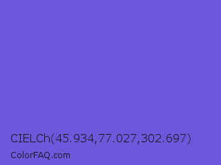 CIELCh 45.934,77.027,302.697 Color is a normal indigo color and the nearest color is Majorelle Blue #6050dc. Hex code #6b58db and RGB value is rgb(107,88,219). In RGB color space, this color is composed of 42% red, 35% green, 86% blue, In CMYK color space, this color is composed of 51% cyan, 60% magenta, 0% yellow , 14% black , In HSL color space, this color has a hue angle of 249° , 65% saturation and 60% lightness.