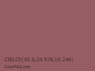 CIELCh 45.9,24.978,16.246 Color is a normal red color and the nearest color is Au Chico #97605d. Hex code #965d62 and RGB value is rgb(150,93,98). In RGB color space, this color is composed of 59% red, 36% green, 38% blue, In CMYK color space, this color is composed of 0% cyan, 38% magenta, 35% yellow , 41% black , In HSL color space, this color has a hue angle of 355° , 23% saturation and 48% lightness.