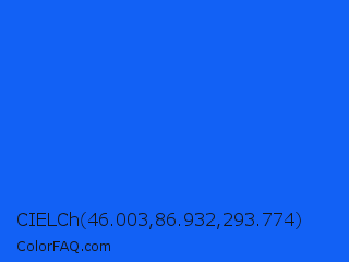 CIELCh 46.003,86.932,293.774 Color is a normal blue color and the nearest color is Blue Ribbon #0066ff. Hex code #1261f5 and RGB value is rgb(18,97,245). In RGB color space, this color is composed of 7% red, 38% green, 96% blue, In CMYK color space, this color is composed of 93% cyan, 60% magenta, 0% yellow , 4% black , In HSL color space, this color has a hue angle of 219° , 92% saturation and 52% lightness.