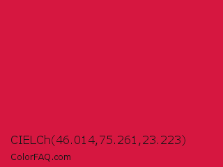 CIELCh 46.014,75.261,23.223 Color is a normal red color and the nearest color is Crimson #dc143c. Hex code #d61740 and RGB value is rgb(214,23,64). In RGB color space, this color is composed of 84% red, 9% green, 25% blue, In CMYK color space, this color is composed of 0% cyan, 89% magenta, 70% yellow , 16% black , In HSL color space, this color has a hue angle of 347° , 81% saturation and 46% lightness.