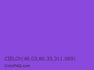 CIELCh 46.03,86.33,311.069 Color is a normal violet color and the nearest color is Navy Purple #9457eb. Hex code #8b48dc and RGB value is rgb(139,72,220). In RGB color space, this color is composed of 55% red, 28% green, 86% blue, In CMYK color space, this color is composed of 37% cyan, 67% magenta, 0% yellow , 14% black , In HSL color space, this color has a hue angle of 267° , 68% saturation and 57% lightness.