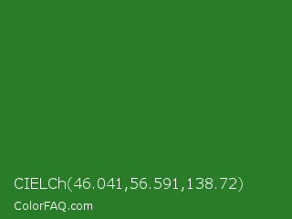 CIELCh 46.041,56.591,138.72 Color is a normal green color and the nearest color is Forest Green #228b22. Hex code #297d29 and RGB value is rgb(41,125,41). In RGB color space, this color is composed of 16% red, 49% green, 16% blue, In CMYK color space, this color is composed of 67% cyan, 0% magenta, 67% yellow , 51% black , In HSL color space, this color has a hue angle of 120° , 51% saturation and 33% lightness.