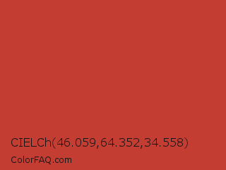 CIELCh 46.059,64.352,34.558 Color is a normal red color and the nearest color is International Orange Golden Gate Bridge #c0362c. Hex code #c43d33 and RGB value is rgb(196,61,51). In RGB color space, this color is composed of 77% red, 24% green, 20% blue, In CMYK color space, this color is composed of 0% cyan, 69% magenta, 74% yellow , 23% black , In HSL color space, this color has a hue angle of 4° , 59% saturation and 48% lightness.