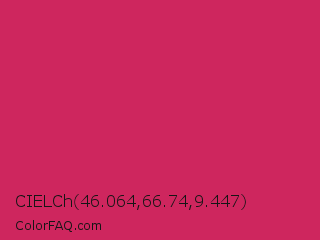 CIELCh 46.064,66.74,9.447 Color is a normal rose color and the nearest color is Rose Red #c21e56. Hex code #ce265e and RGB value is rgb(206,38,94). In RGB color space, this color is composed of 81% red, 15% green, 37% blue, In CMYK color space, this color is composed of 0% cyan, 82% magenta, 54% yellow , 19% black , In HSL color space, this color has a hue angle of 340° , 69% saturation and 48% lightness.