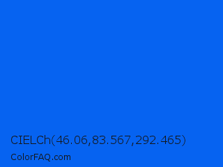 CIELCh 46.06,83.567,292.465 Color is a normal blue color and the nearest color is Blue Ribbon #0066ff. Hex code #0663f1 and RGB value is rgb(6,99,241). In RGB color space, this color is composed of 2% red, 39% green, 95% blue, In CMYK color space, this color is composed of 98% cyan, 59% magenta, 0% yellow , 5% black , In HSL color space, this color has a hue angle of 216° , 95% saturation and 48% lightness.
