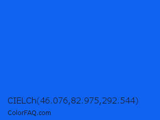 CIELCh 46.076,82.975,292.544 Color is a normal blue color and the nearest color is Blue Ribbon #0066ff. Hex code #1063f0 and RGB value is rgb(16,99,240). In RGB color space, this color is composed of 6% red, 39% green, 94% blue, In CMYK color space, this color is composed of 93% cyan, 59% magenta, 0% yellow , 6% black , In HSL color space, this color has a hue angle of 218° , 88% saturation and 50% lightness.