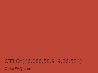 CIELCh 46.086,58.919,36.524 Color is a normal red color and the nearest color is Mojo #c04737. Hex code #bd4535 and RGB value is rgb(189,69,53). In RGB color space, this color is composed of 74% red, 27% green, 21% blue, In CMYK color space, this color is composed of 0% cyan, 63% magenta, 72% yellow , 26% black , In HSL color space, this color has a hue angle of 7° , 56% saturation and 47% lightness.