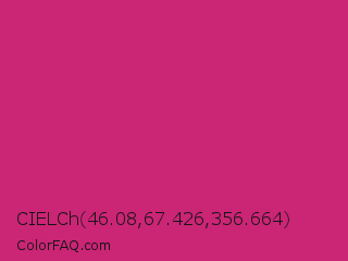 CIELCh 46.08,67.426,356.664 Color is a normal rose color and the nearest color is Magenta Dye #ca1f7b. Hex code #cb2576 and RGB value is rgb(203,37,118). In RGB color space, this color is composed of 80% red, 15% green, 46% blue, In CMYK color space, this color is composed of 0% cyan, 82% magenta, 42% yellow , 20% black , In HSL color space, this color has a hue angle of 331° , 69% saturation and 47% lightness.