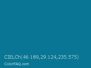 CIELCh 46.189,29.124,235.575 Color is a normal cyan color and the nearest color is Metallic Seaweed #0a7e8c. Hex code #077795 and RGB value is rgb(7,119,149). In RGB color space, this color is composed of 3% red, 47% green, 58% blue, In CMYK color space, this color is composed of 95% cyan, 20% magenta, 0% yellow , 42% black , In HSL color space, this color has a hue angle of 193° , 91% saturation and 31% lightness.
