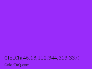 CIELCh 46.18,112.344,313.337 Color is a normal purple color and the nearest color is Veronica #a020f0. Hex code #992bfa and RGB value is rgb(153,43,250). In RGB color space, this color is composed of 60% red, 17% green, 98% blue, In CMYK color space, this color is composed of 39% cyan, 83% magenta, 0% yellow , 2% black , In HSL color space, this color has a hue angle of 272° , 95% saturation and 57% lightness.