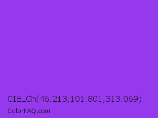 CIELCh 46.213,101.801,313.069 Color is a normal purple color and the nearest color is Blue Violet #8a2be2. Hex code #9638ed and RGB value is rgb(150,56,237). In RGB color space, this color is composed of 59% red, 22% green, 93% blue, In CMYK color space, this color is composed of 37% cyan, 76% magenta, 0% yellow , 7% black , In HSL color space, this color has a hue angle of 271° , 83% saturation and 57% lightness.
