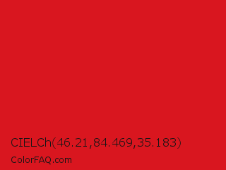 CIELCh 46.21,84.469,35.183 Color is a normal red color and the nearest color is Maximum Red #d92121. Hex code #d9161f and RGB value is rgb(217,22,31). In RGB color space, this color is composed of 85% red, 9% green, 12% blue, In CMYK color space, this color is composed of 0% cyan, 90% magenta, 86% yellow , 15% black , In HSL color space, this color has a hue angle of 357° , 82% saturation and 47% lightness.
