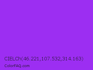 CIELCh 46.221,107.532,314.163 Color is a normal purple color and the nearest color is Veronica #a020f0. Hex code #9c2ef2 and RGB value is rgb(156,46,242). In RGB color space, this color is composed of 61% red, 18% green, 95% blue, In CMYK color space, this color is composed of 36% cyan, 81% magenta, 0% yellow , 5% black , In HSL color space, this color has a hue angle of 274° , 88% saturation and 56% lightness.