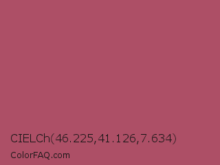 CIELCh 46.225,41.126,7.634 Color is a normal red color and the nearest color is Cadillac #b04c6a. Hex code #ad4f66 and RGB value is rgb(173,79,102). In RGB color space, this color is composed of 68% red, 31% green, 40% blue, In CMYK color space, this color is composed of 0% cyan, 54% magenta, 41% yellow , 32% black , In HSL color space, this color has a hue angle of 345° , 37% saturation and 49% lightness.