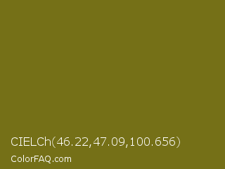 CIELCh 46.22,47.09,100.656 Color is a dark yellow color and the nearest color is Olivetone #716e10. Hex code #757017 and RGB value is rgb(117,112,23). In RGB color space, this color is composed of 46% red, 44% green, 9% blue, In CMYK color space, this color is composed of 0% cyan, 4% magenta, 80% yellow , 54% black , In HSL color space, this color has a hue angle of 57° , 67% saturation and 27% lightness.