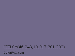 CIELCh 46.243,19.917,301.302 Color is a normal indigo color and the nearest color is Rum #796989. Hex code #71698a and RGB value is rgb(113,105,138). In RGB color space, this color is composed of 44% red, 41% green, 54% blue, In CMYK color space, this color is composed of 18% cyan, 24% magenta, 0% yellow , 46% black , In HSL color space, this color has a hue angle of 255° , 14% saturation and 48% lightness.
