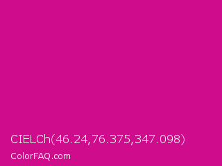 CIELCh 46.24,76.375,347.098 Color is a normal magenta color and the nearest color is Red Violet #c71585. Hex code #cf0d8c and RGB value is rgb(207,13,140). In RGB color space, this color is composed of 81% red, 5% green, 55% blue, In CMYK color space, this color is composed of 0% cyan, 94% magenta, 32% yellow , 19% black , In HSL color space, this color has a hue angle of 321° , 88% saturation and 43% lightness.