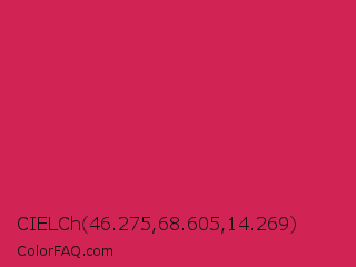 CIELCh 46.275,68.605,14.269 Color is a normal rose color and the nearest color is Rose Red #c21e56. Hex code #d12455 and RGB value is rgb(209,36,85). In RGB color space, this color is composed of 82% red, 14% green, 33% blue, In CMYK color space, this color is composed of 0% cyan, 83% magenta, 59% yellow , 18% black , In HSL color space, this color has a hue angle of 343° , 71% saturation and 48% lightness.