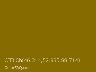 CIELCh 46.314,52.935,88.714 Color is a dark yellow color and the nearest color is Corn Harvest #8b6b0b. Hex code #856b00 and RGB value is rgb(133,107,0). In RGB color space, this color is composed of 52% red, 42% green, 0% blue, In CMYK color space, this color is composed of 0% cyan, 20% magenta, 100% yellow , 48% black , In HSL color space, this color has a hue angle of 48° , 100% saturation and 26% lightness.