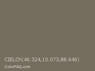 CIELCh 46.324,10.073,88.646 Color is a normal orange color and the nearest color is Pablo #776f61. Hex code #756d5d and RGB value is rgb(117,109,93). In RGB color space, this color is composed of 46% red, 43% green, 36% blue, In CMYK color space, this color is composed of 0% cyan, 7% magenta, 21% yellow , 54% black , In HSL color space, this color has a hue angle of 40° , 11% saturation and 41% lightness.