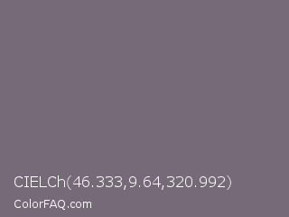 CIELCh 46.333,9.64,320.992 Color is a normal purple color and the nearest color is Fedora #796a78. Hex code #766a78 and RGB value is rgb(118,106,120). In RGB color space, this color is composed of 46% red, 42% green, 47% blue, In CMYK color space, this color is composed of 2% cyan, 12% magenta, 0% yellow , 53% black , In HSL color space, this color has a hue angle of 291° , 6% saturation and 44% lightness.