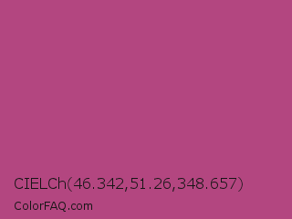 CIELCh 46.342,51.26,348.657 Color is a normal rose color and the nearest color is Mystic Maroon #ad4379. Hex code #b34680 and RGB value is rgb(179,70,128). In RGB color space, this color is composed of 70% red, 27% green, 50% blue, In CMYK color space, this color is composed of 0% cyan, 61% magenta, 28% yellow , 30% black , In HSL color space, this color has a hue angle of 328° , 44% saturation and 49% lightness.