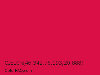 CIELCh 46.342,76.193,20.888 Color is a normal rose color and the nearest color is Crimson #dc143c. Hex code #d90f45 and RGB value is rgb(217,15,69). In RGB color space, this color is composed of 85% red, 6% green, 27% blue, In CMYK color space, this color is composed of 0% cyan, 93% magenta, 68% yellow , 15% black , In HSL color space, this color has a hue angle of 344° , 87% saturation and 45% lightness.