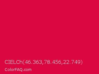 CIELCh 46.363,78.456,22.749 Color is a normal rose color and the nearest color is Rich Carmine #d70040. Hex code #db0540 and RGB value is rgb(219,5,64). In RGB color space, this color is composed of 86% red, 2% green, 25% blue, In CMYK color space, this color is composed of 0% cyan, 98% magenta, 71% yellow , 14% black , In HSL color space, this color has a hue angle of 343° , 96% saturation and 44% lightness.