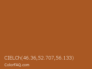 CIELCh 46.36,52.707,56.133 Color is a normal orange color and the nearest color is Paarl #a65529. Hex code #a95823 and RGB value is rgb(169,88,35). In RGB color space, this color is composed of 66% red, 35% green, 14% blue, In CMYK color space, this color is composed of 0% cyan, 48% magenta, 79% yellow , 34% black , In HSL color space, this color has a hue angle of 24° , 66% saturation and 40% lightness.
