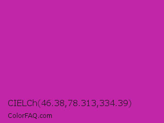 CIELCh 46.38,78.313,334.39 Color is a normal magenta color and the nearest color is Byzantine #bd33a4. Hex code #c126a8 and RGB value is rgb(193,38,168). In RGB color space, this color is composed of 76% red, 15% green, 66% blue, In CMYK color space, this color is composed of 0% cyan, 80% magenta, 13% yellow , 24% black , In HSL color space, this color has a hue angle of 310° , 67% saturation and 45% lightness.